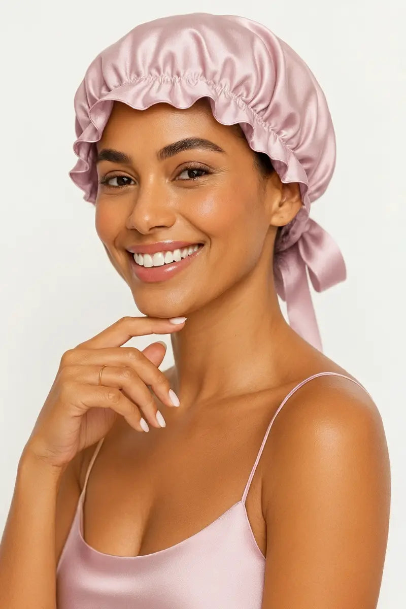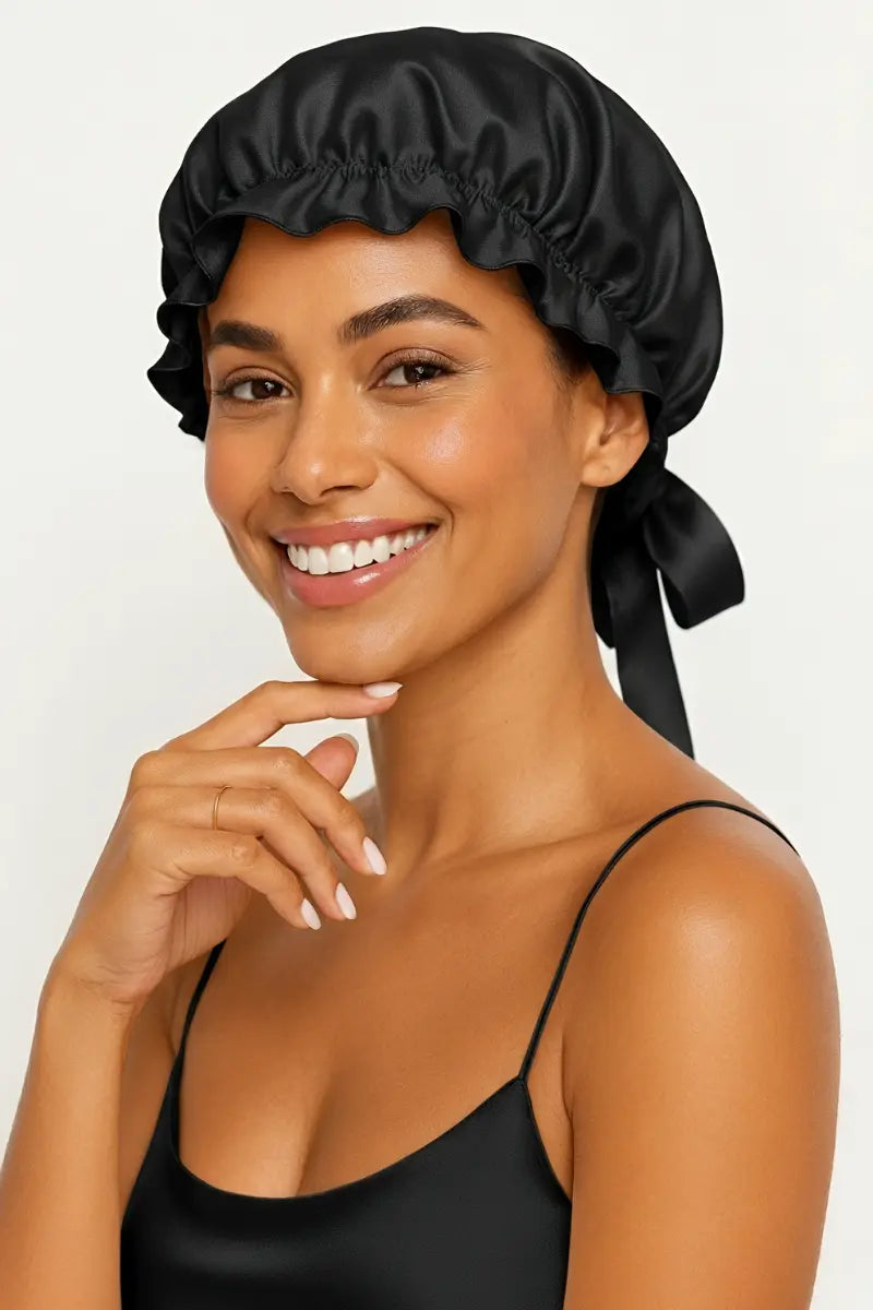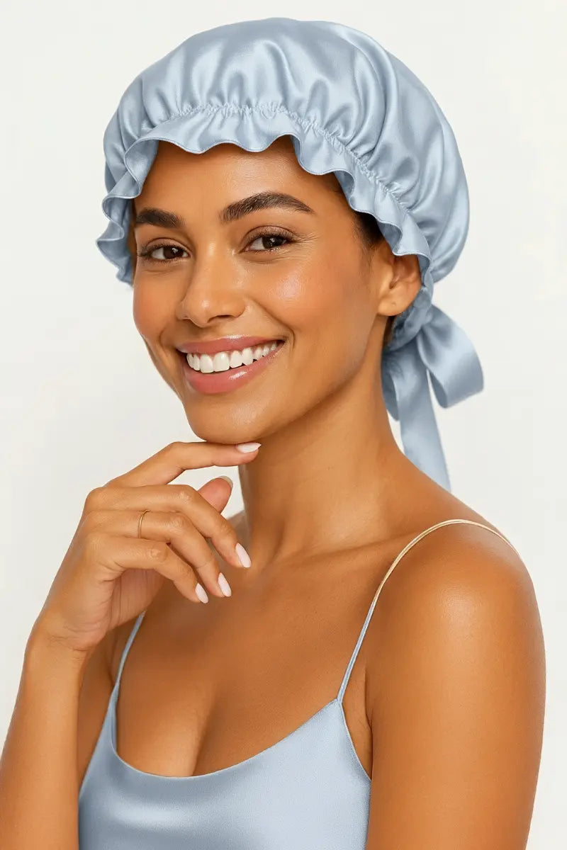 Dormir avec un bonnet en soie permet de limiter les agressions extérieures et le contact rugueux avec les tissus. Résultat : des cheveux plus solides, moins fragiles et mieux préservés au quotidien.